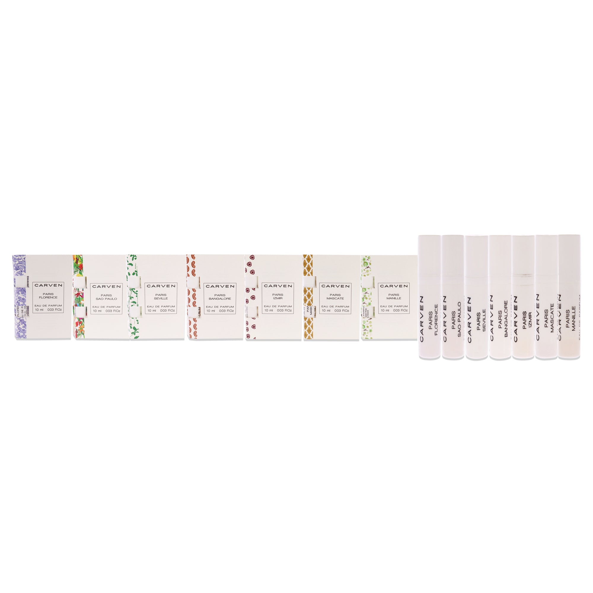 Carven Collection Mini Sampler Set for Women - 7 Pc Vial Set 0.03oz Paris Seville, Manille, Sao Paulo, Florence, Mascate, Izmir, Bangalore EDP Spray - Perfect Gift Idea